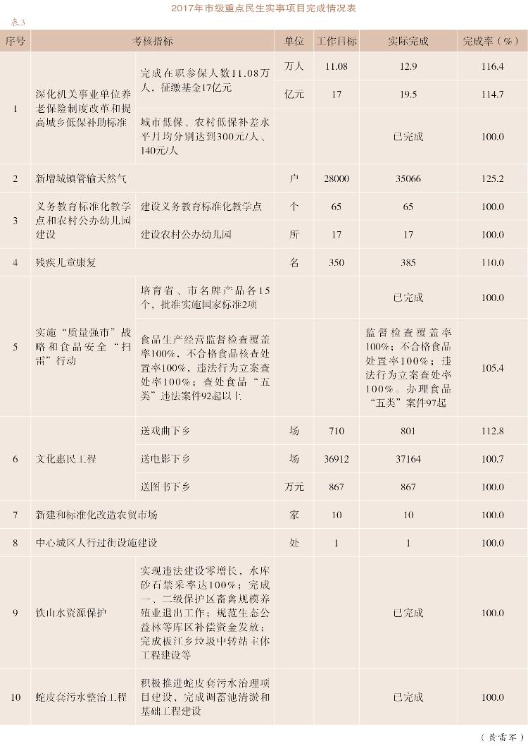 【重点民生实事办理】 2017年,岳阳市20件省市重点民生实事全部完成或超额完成任务。在全省绩效评估中,岳阳市重点民生实事工作获得满分。省市重点民生实事指标任务明确后,市实事办对指标任务进行分解,以两办名义下发《关于认真做好2017年省市重点民生实事工作的通知》,明确每项指标任务由市政府分管副市长牵头负责,市政府分管副秘书长为具体责任人,相关部门单位一把手为直接责任人;同时,对实事主要责任单位和相关责任单位的职责、实事协调领导小组成员单位的职责一并进行明确。市直各责任单位、各县市区政府根据所承办实事指标内容,编制实施方案,详细制订工作措施,排出时间进度表,明确实事联络员,按照谁主管、谁负责的原则,对资金筹措、问题协调、组织实施、工作联络等工作定人定责。市实事办按照“月调度、季讲评、半年检查、年终考核”的要求,各责任单位在每月25日报送项目进度,按月对实事项目进展情况进行调度,对进度滞后的实事项目进行跟踪督查。至年底,召开重点民生实事工作调度会3次,开展现场督查8次,下发督办函16份。省市重点民生实事工作纳入全市2017年综合绩效考评范围,明确规定“未全面完成2017年度省市重点民生实事任务的单位取消年度评先资格”。市实事办完善考核验收标准和考核办法,在年底通过查阅台账资料、电话抽查和现场核实等方式,对重点民生实事项目进行考核和验收。