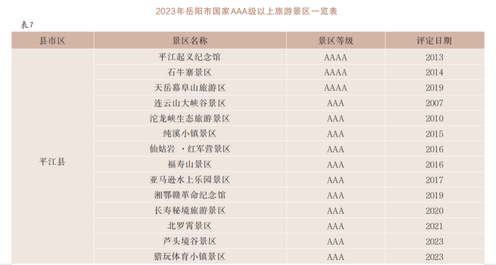 【张谷英景区】国家AAAA级旅游景区。张谷英古村,位于岳阳县以南,是中国保存较为完整的江南民居古建筑群落,全国重点文物保护单位,中国历史文化名村。具有孝友文化、农耕文化、建筑文化特色,主要景点有百步三桥、上新屋、接官厅、议事厅、王家塅、当大门。2023年度接待游客78.87万人次,实现旅游收入8818.5万元。