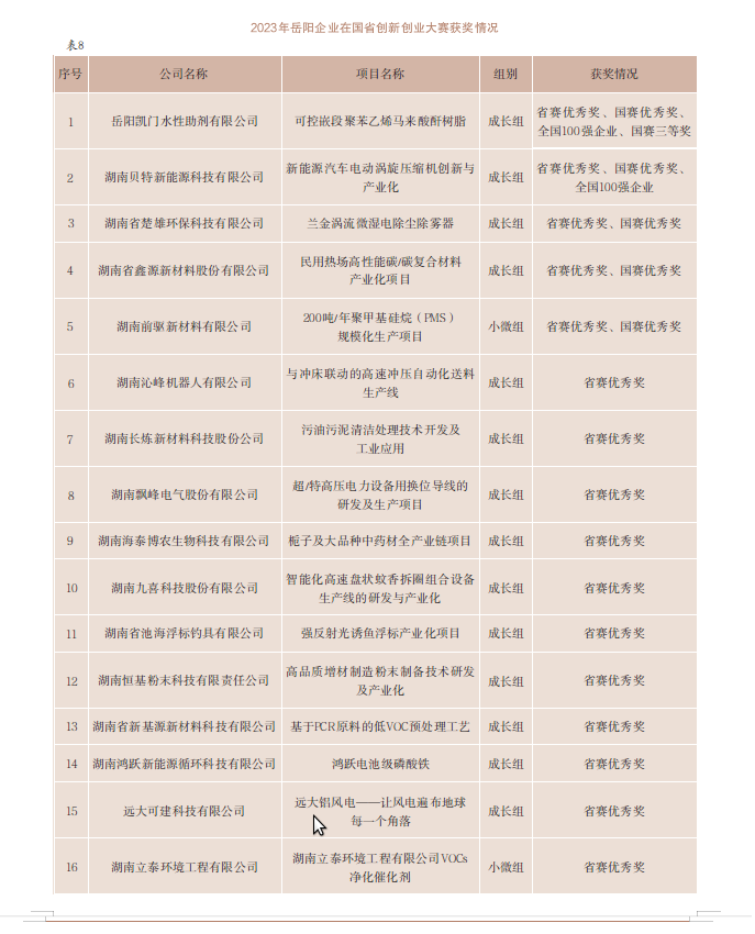 【创新创业大赛】2023年7月,岳阳市组织完成“隆兴实业杯”2023年岳阳市创新创业大赛暨现代石化专业赛。本届大赛由湖南省科技厅指导,岳阳市人民政府主办,岳阳市科学技术局、岳阳市云溪区人民政府、岳阳绿色化工高新技术产业开发区管理委员会承办,岳阳隆兴实业有限公司冠名。大赛设置小微企业组、成长企业组、现代石化小微企业组、现代石化成长企业组四个组别,147家企业报名参赛,其中,7家企业取得大赛直通车资格直接进入湖南省半决赛,46家企业进入市赛决赛,决出一等奖4名,二等奖7名,三等奖10名,优秀奖22名,岳阳凯门水性助剂有限公司获现代石化成长组一等奖、湖南省楚雄环保科技有限公司获成长组一等奖、湖南前驱新材料有限公司获现代石化小微组一等奖、湖南三湘四海水务有限公司获小微组一等奖。41家企业进入省赛,16家企业获得优秀奖,6家企业获得参加全国赛资格。在国赛中,5家企业获得优秀奖,其中,岳阳凯门水性助剂有限公司、湖南贝特新能源科技有限公司晋级总决赛入围全国100强,岳阳凯门水性助剂有限公司获总决赛成长组三等奖。