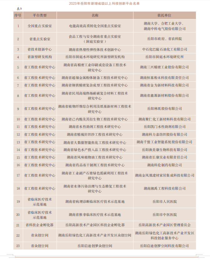 【创新平台建设】2023年,岳阳市加快融入省“四大实验室”,依托市科技事务中心成立实验室服务中心,完善全市创新平台体系建设。洞庭实验室挂牌开工建设,组建汨罗长乐甜酒研发中心和华容芥菜研究中心;湘江实验室区域创新中心围绕数字政府、智慧岳阳等领域;岳麓山种业创新中心洞庭湖区域中心(岳阳分中心)召开首届“看禾选种”现场观摩会暨“岳阳·禾田议事”主题沙龙;芙蓉实验室区域中心筹备建设。依托湖南理工学院、中国科学院过程工程研究所等高校科研机构,成立湖南现代石化产业协同创新研究院,助力湖南现代万亿石化产业集群核心基地建设。新增省级以上创新平台23家,中科电气参与联合共建“电能高效高质转化全国重点实验室”;组建市级创新平台34家,其中,新型研发机构1家、重点实验室5家、工程技术研究中心7家、科普基地7家、临床医疗示范基地5家、科技企业孵化器1家、众创空间2家、星创天地6家。